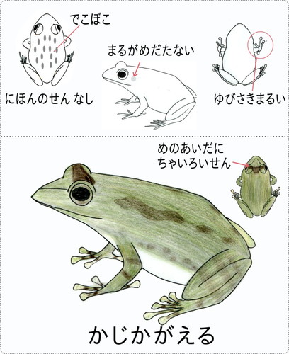 分布域text 生息環境渓流 観察できる季節初夏から秋 特徴1、背中に二本の線はない 2、背中はでこぼこしている 3、目の間に黒い模様がある 4、指先に吸盤がある 渓流にすんでいる 鳴き声:ふぃふぃふぃふぃふぃー(笛みたい) ↑カエルとは思えない声 |