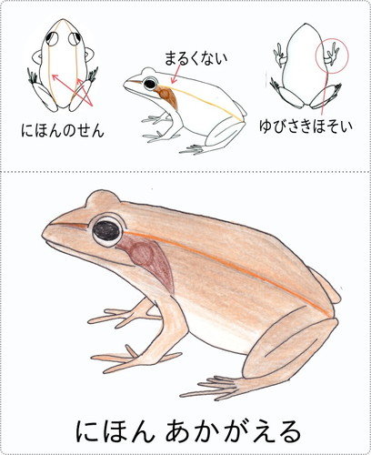 分布域text 生息環境関西:林縁から林内、東北:田んぼのまわり 観察できる季節早春 特徴1、背中に二本の線がある 2、目の後ろの茶色いところはまるくない 3、背中の二本の線は、目のところで曲がる 4、吸盤はない 冬のまだ寒い時期に湧き水のたまりなどで繁殖する ※東北では田んぼの耕作期に田んぼで繁殖する 鳴き声: |