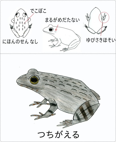 分布域text 生息環境text 観察できる季節一年中(特に春から秋) 特徴1、背中に二本の線がない 2、背中はでこぼこしている 3、目の後ろの茶色い丸はめだたない 4、吸盤を持たない おたまじゃくしで冬を越える ↑繁殖には冬にも水がある水辺が必要 鳴き声:ぎゅーぎゅーぎゅー(押しつぶすような感じ) |