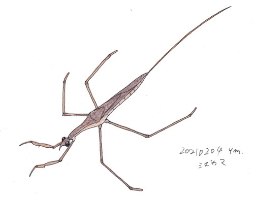 分布域北海道~九州および南西諸島 生息環境比較的水深の深い、流れのない水域 観察できる季節一年中(秋から翌春=ため池、初夏から秋=田んぼ) 特徴形態・色彩 とても細長い体に、長い呼吸管、かま状の前脚 カマキリに似ているけど、カメムシの仲間 生きた昆虫や小魚、おたまじゃくしなどを捕獲して、体内に消化液を注入し、中身を吸い取る とてもよく飛ぶ |